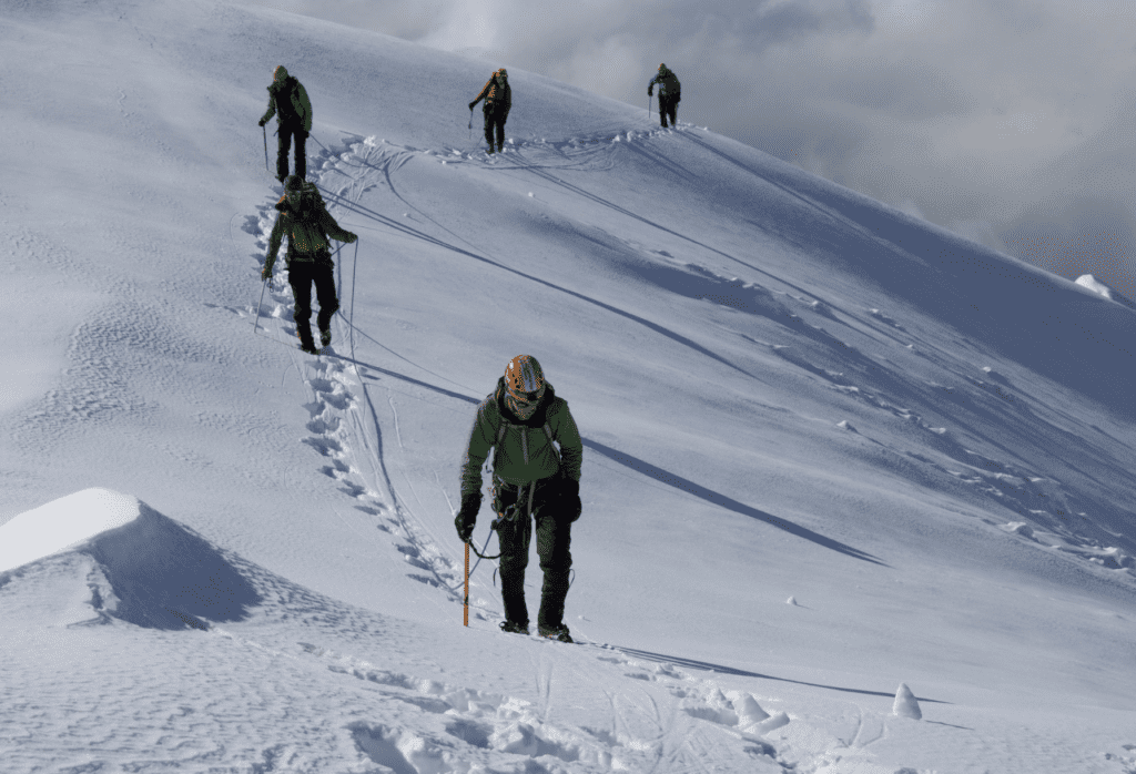 We left high camp at 3 am and made our way through 3rd and 4th class scrambling to crampon point at the start of the glacier at 5,800 m. We made good time and arrived at 5 am as the sun was beginning to rise. We started on the glacier and very quickly realized that there were no ladders, no path, no ropes, and a lot of crevasses. The route turned into a complex maze of crevasses where we started belaying each other across thin snow bridges. It was the most amazing feeling having the creativity of climbing a mountain without a path, especially in a place as epic as the Himalayas and the setting that we were in. We made our way safely through 3 crevasse crossings where we were traversing 80-90 degree ice walls with crevasses looming below us. Absolutely exposed and epic.